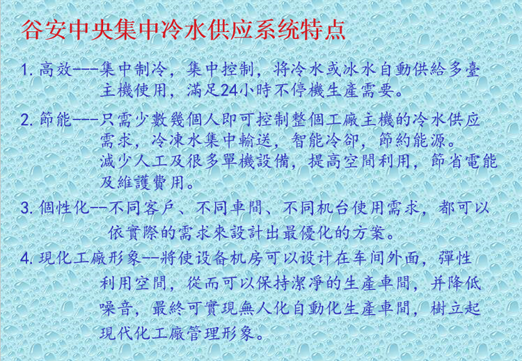 • 簡介:谷安自動化專注設(shè)計生產(chǎn)車間的冷卻水管路,冰水中央集中供應(yīng),壓縮空氣集中供應(yīng),電路電柜安裝施工。