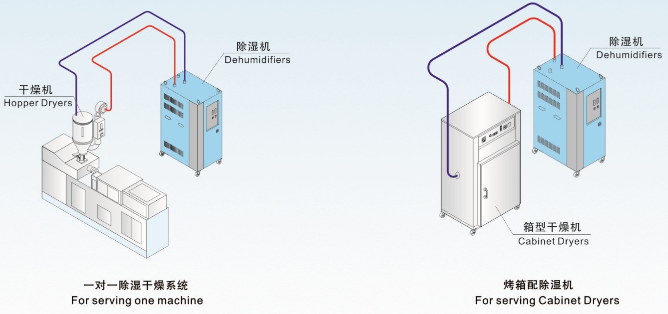 在PET瓶胚系統制程中,干燥成為尤為關鍵的階段,必須確保原料中的水分被除去并且干燥溫度合理。谷安的除濕干燥機可提供-40℃或更低露點干燥空氣,并可實現適時監控各項參數及確保露點恒定。
