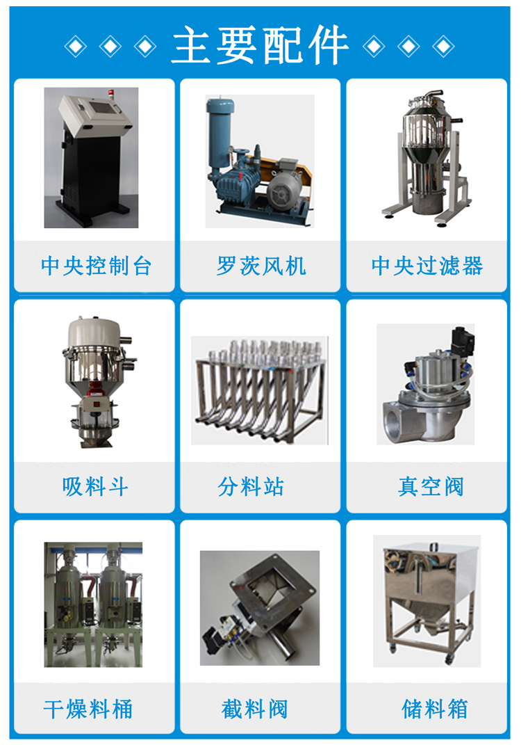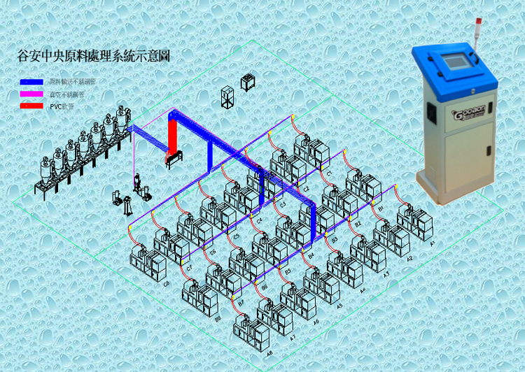 中央供料系統包含:自動粉碎回收+原料儲存+原料混合+塑料除濕+原料干燥+原料輸送+色母喂料+稱量混合+PLC編程控制+除塵系統+管路安裝+流體計算和控制+及與無塵室,水電氣系統的搭配等等。