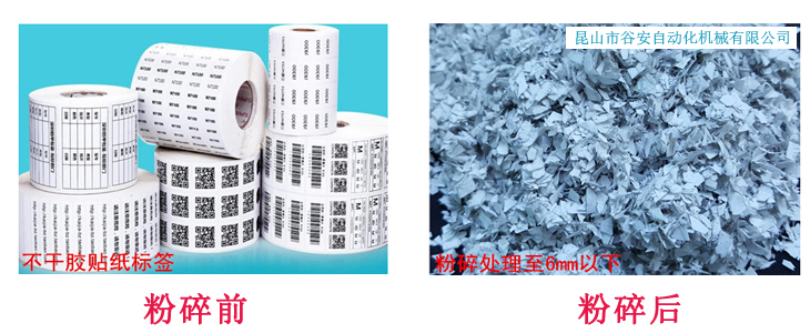 不干膠標(biāo)簽紙粉碎機(jī)將印刷行業(yè)帶有離型紙、面紙粘合的粘膠劑三部分組成的不干膠標(biāo)簽粉碎,破壞其數(shù)據(jù),回收再利用。